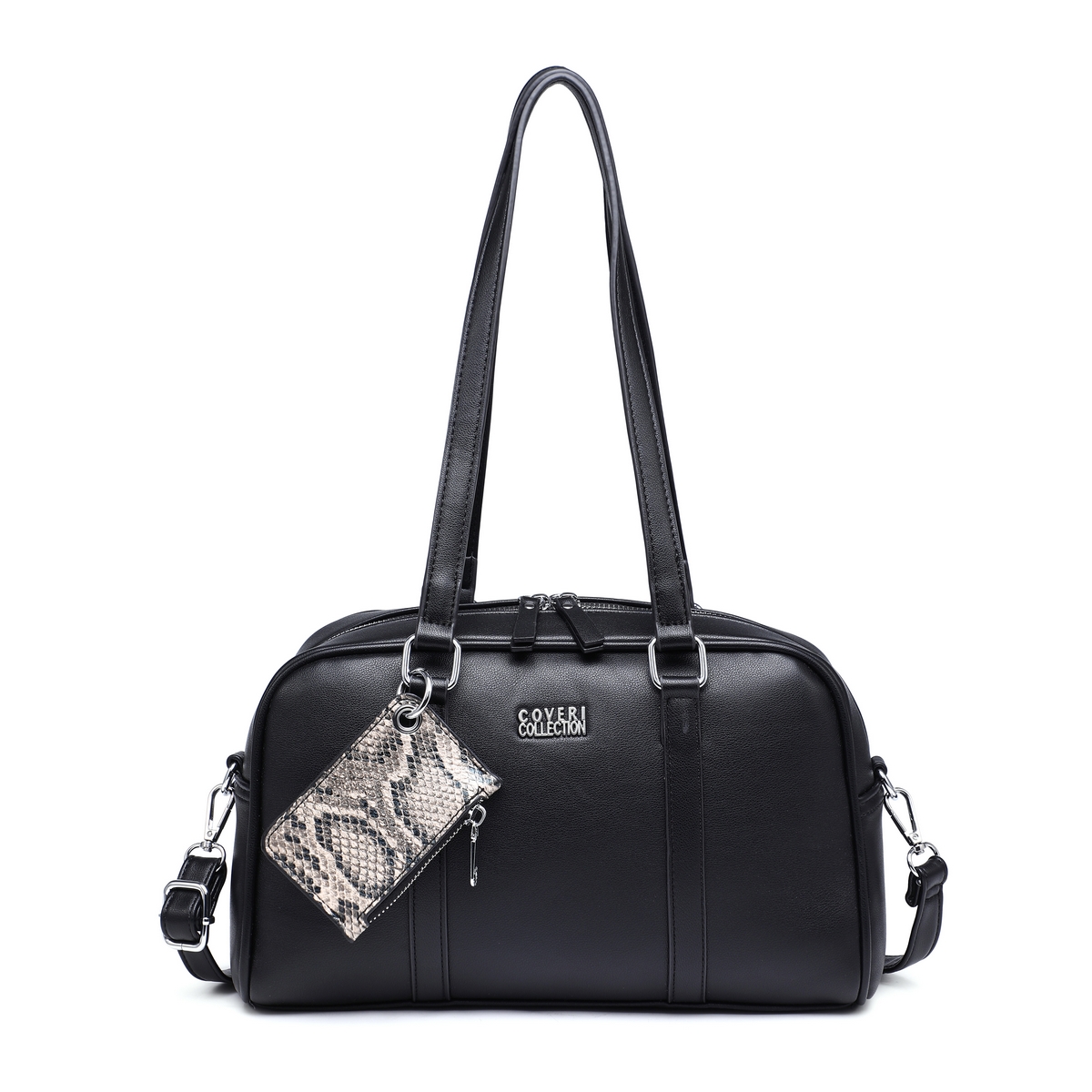 Γυναικεία Τσάντα Δερματίνη Coveri με δύο χέρια βαρελάκι και κρεμαστό πορτοφόλι με snake effect . Διαστάσεις: Πλάτος 31εκ. × Ύψος 19 εκ. × Πάτος 10εκ.