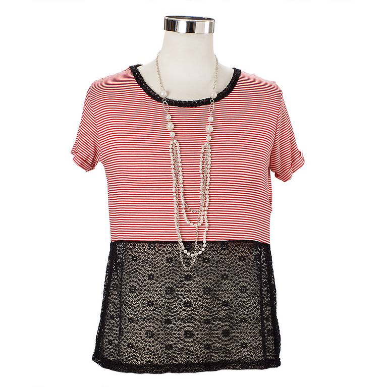 Γυναικεία Μπλούζα Βισκώζ μισή με ρίγες & μισή με δαντέλα & κολιέ μακρύ με πέρλες. Σύνθεση: 95% Βισκώζ/5% Ελαστίνη