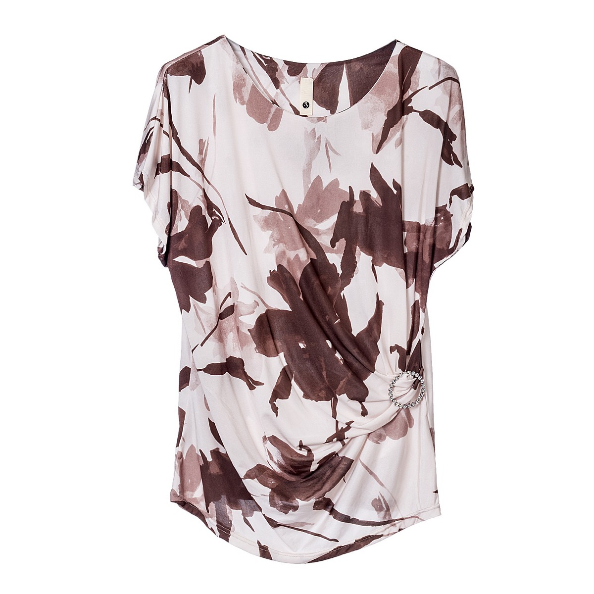 Γυναικεία Μπλούζα φλοράλ τρίχρωμη με κρίκο και στράς στο πλάι . Σύνθεση:95 % πολυεστέρας /5 % ελαστίνη
