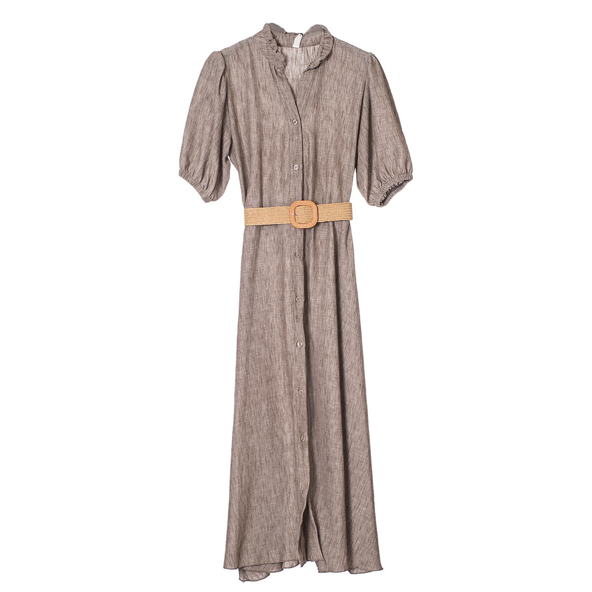 Γυναικείο Φόρεμα μακρύ με φουσκωτό μανίκι με λάστιχο μάο γιακά και ψάθινη ζώνη. Σύνθεση:100 % πολυεστέρας