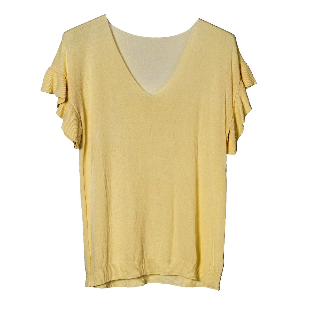 Γυναικεία Μπλούζα λεπτή πλέξη με βέ και βολάν στα μανίκια. Σύνθεση:67 % βισκώζη / 37% πολυαμίδη