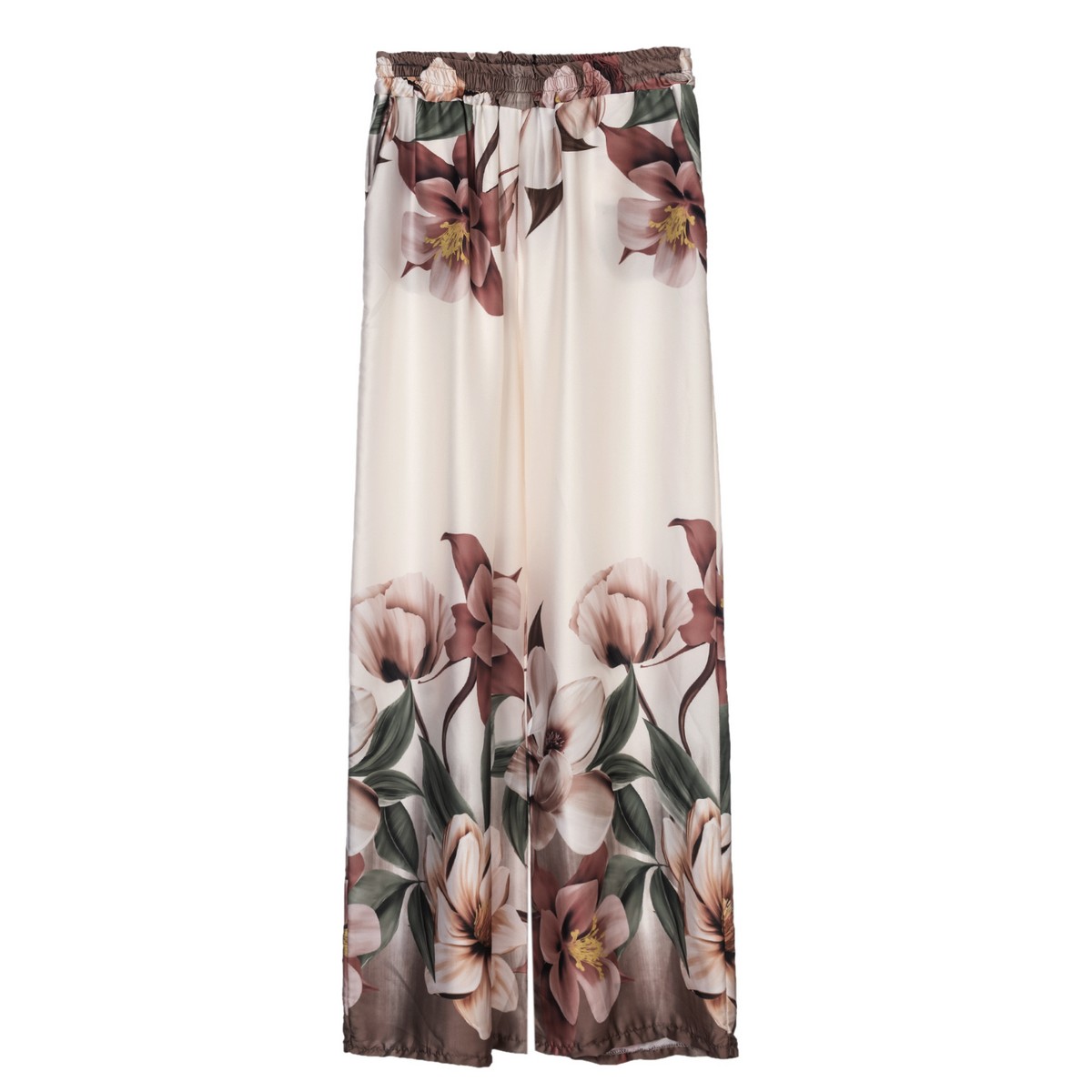 Γυναικεία Παντελόνα φλοράλ σατέν πολύχρωμη με λάστιχο στην μέση και τσέπες. Σύνθεση:97 % πολυεστέρας /3 % spandex