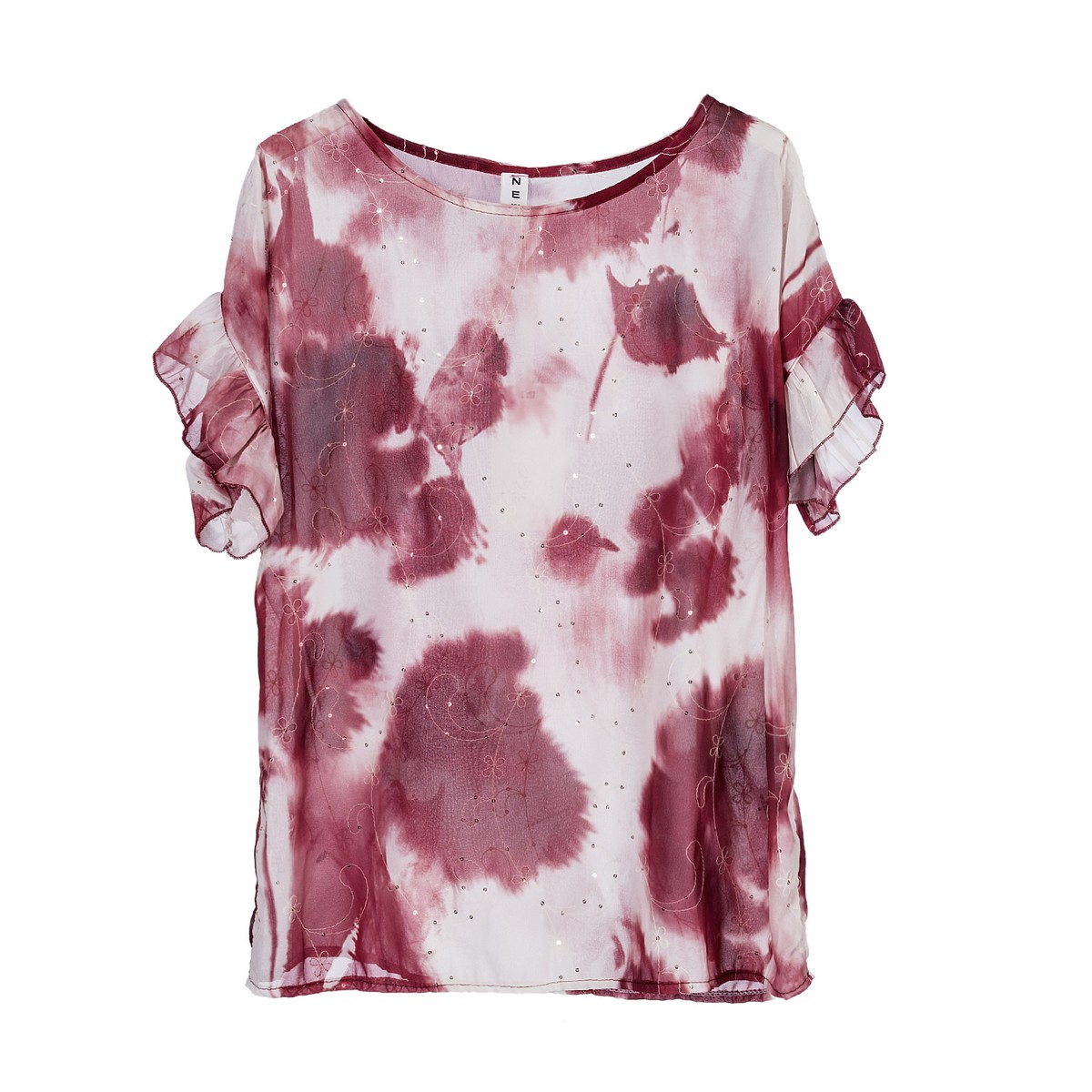 Γυναικείο Μπλούζα με βολάν στο μανίκι και κέντημα με πούλιες . Σύνθεση: 95% Βισκώζ / 5% Ελαστίνη