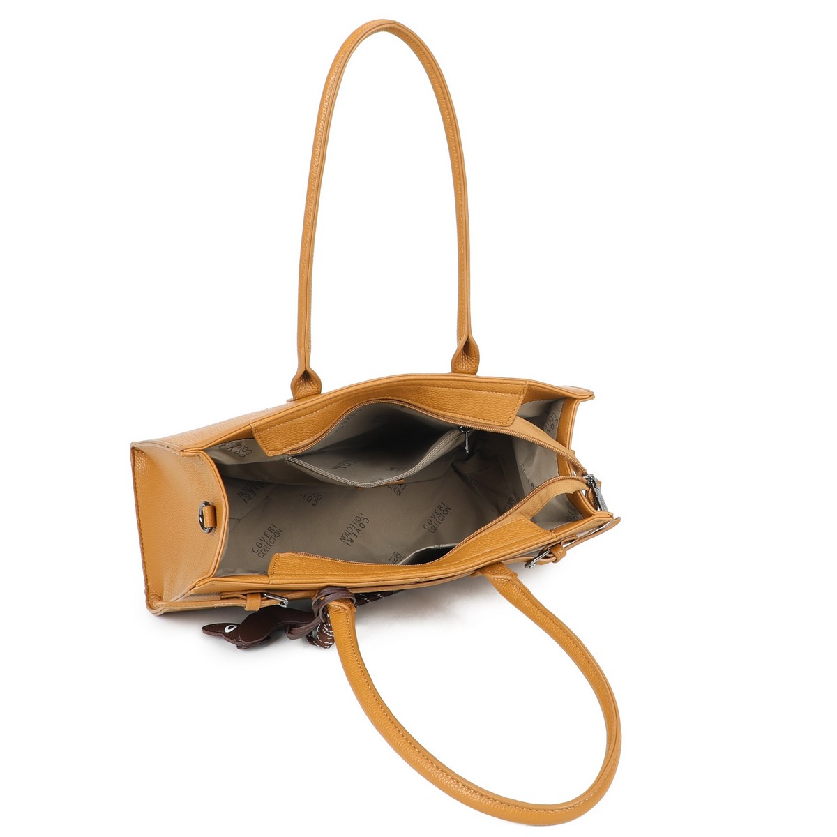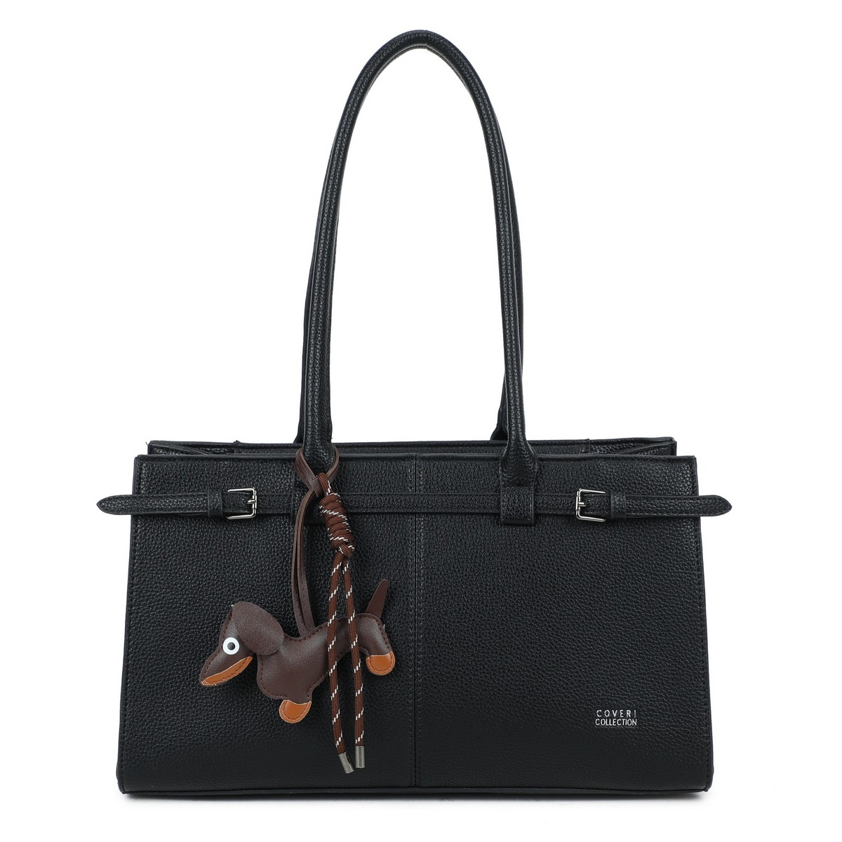 Τσάντα Δερματίνη Coveri μεγάλη ώμου ορθογώνια με δύο αγκράφες και διακοσμητικό κρεμαστό σκυλάκι. Διαθέτει τσέπες εσωτερικά, εξωτερικά στην πίσω πλευρά. Διαθέτει λουρί που αυξομειώνεται για χιαστί. Διάσταση: Πλάτος 36 Χ Ύψος 21Χ Πάτος 14