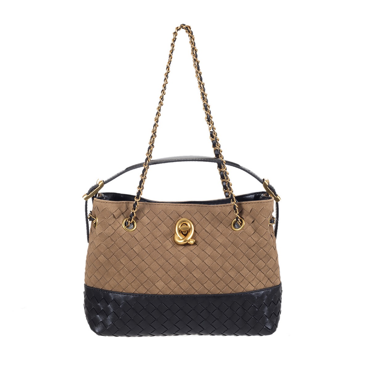 Γυναικεία τσάντα με πλεκτό δίχρωμο κουβαδάκι και χρυσή αλυσίδα