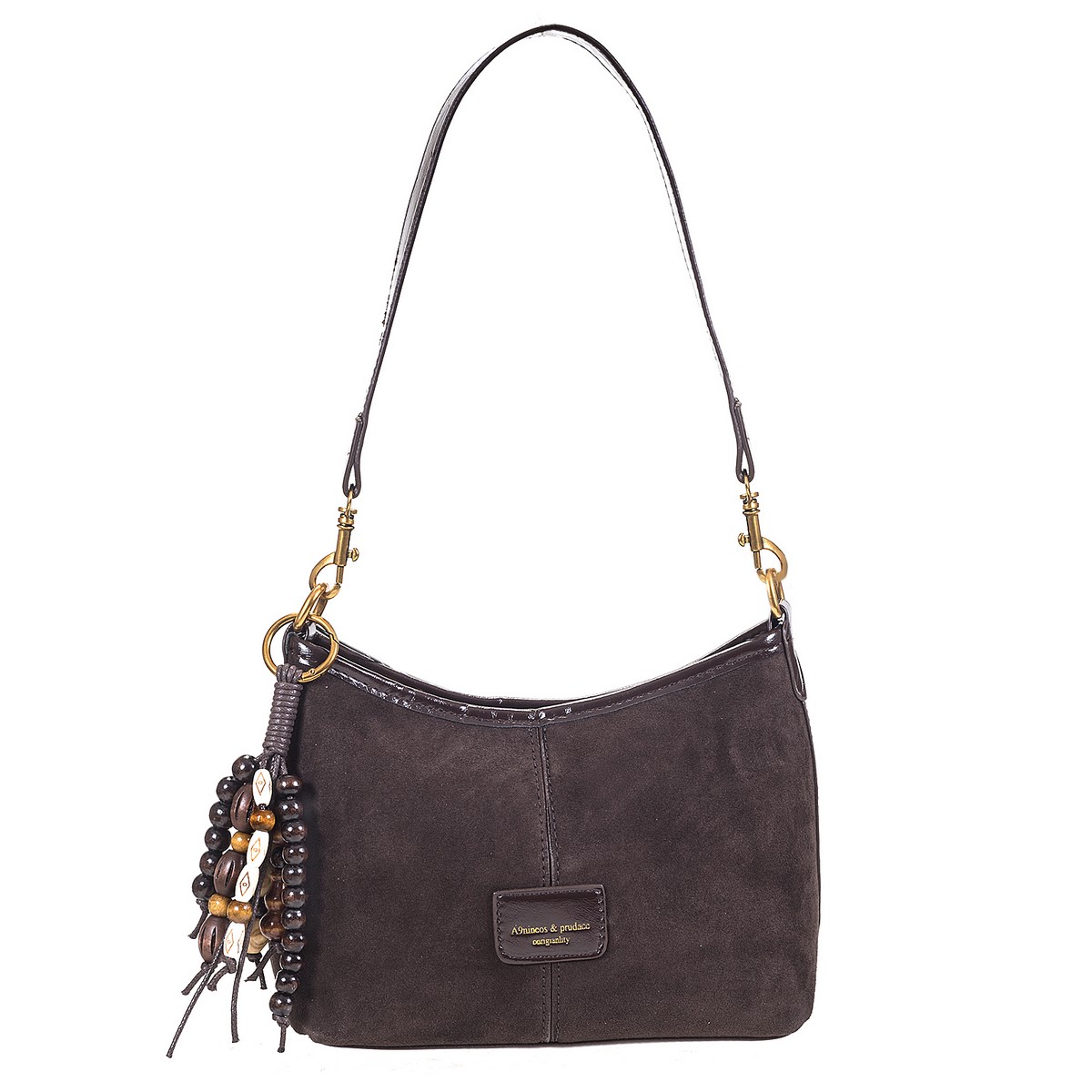 Γυναικεία τσάντα μικρή με σουέτ και δερμάτινο γονδολάκι και charm με χάντρες