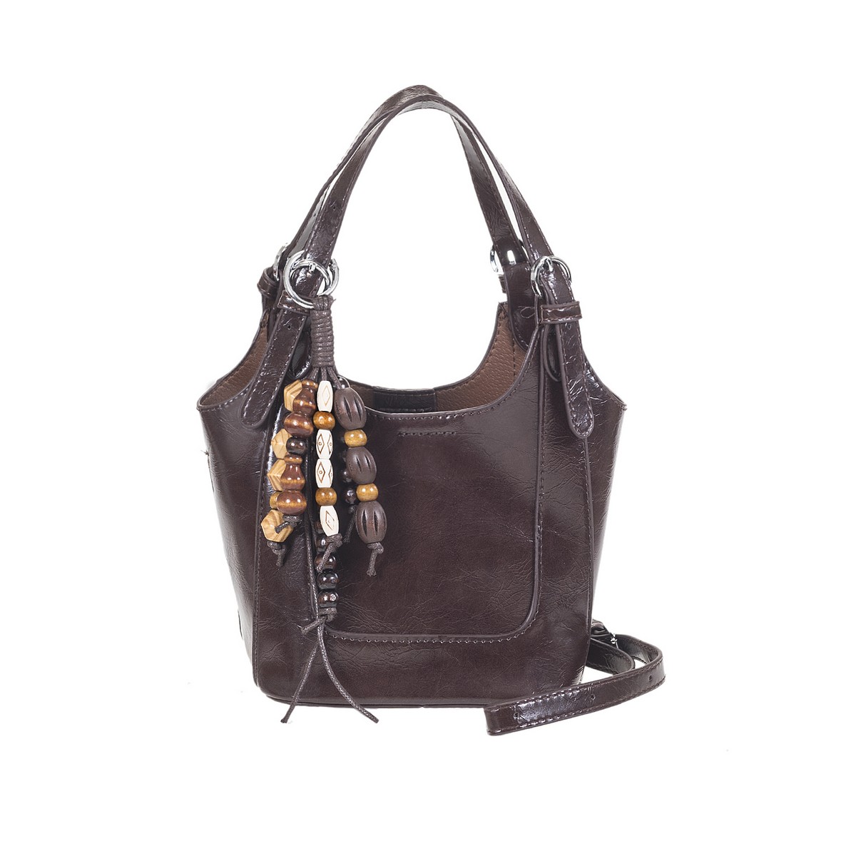 Γυναικεία τσάντα μικρή κουβαδάκι με χερούλι απο λείο δέρμα και charm με χάντρες