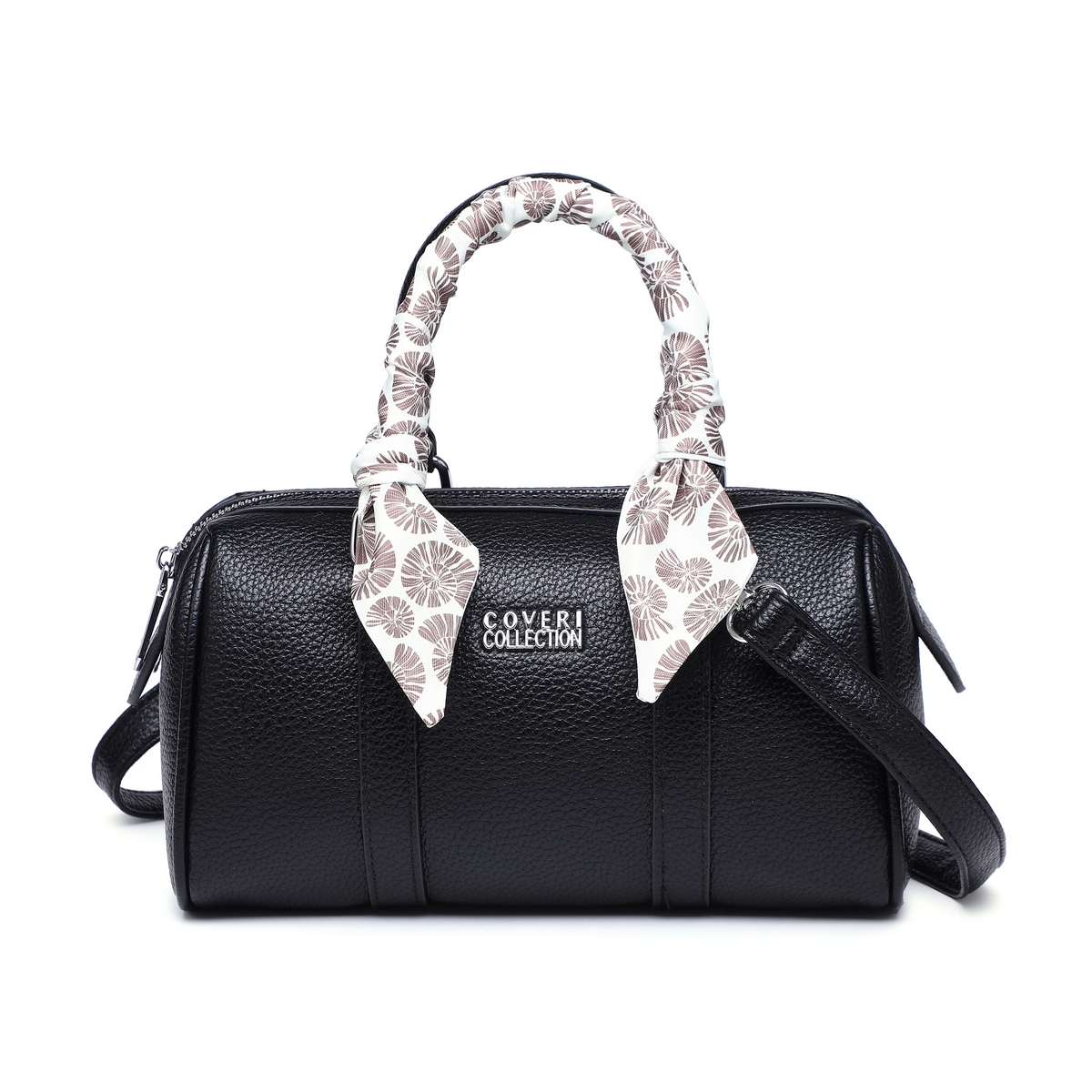 Γυναικεία Τσάντα Δερματίνη Coveri χεριόυ βαρελάκι με διακοσμητικό μαντήλι λουλούδια .Διαστάσεις: Πλάτος 24εκ. × Ύψος 14εκ. × Πάτος 10 εκ.
