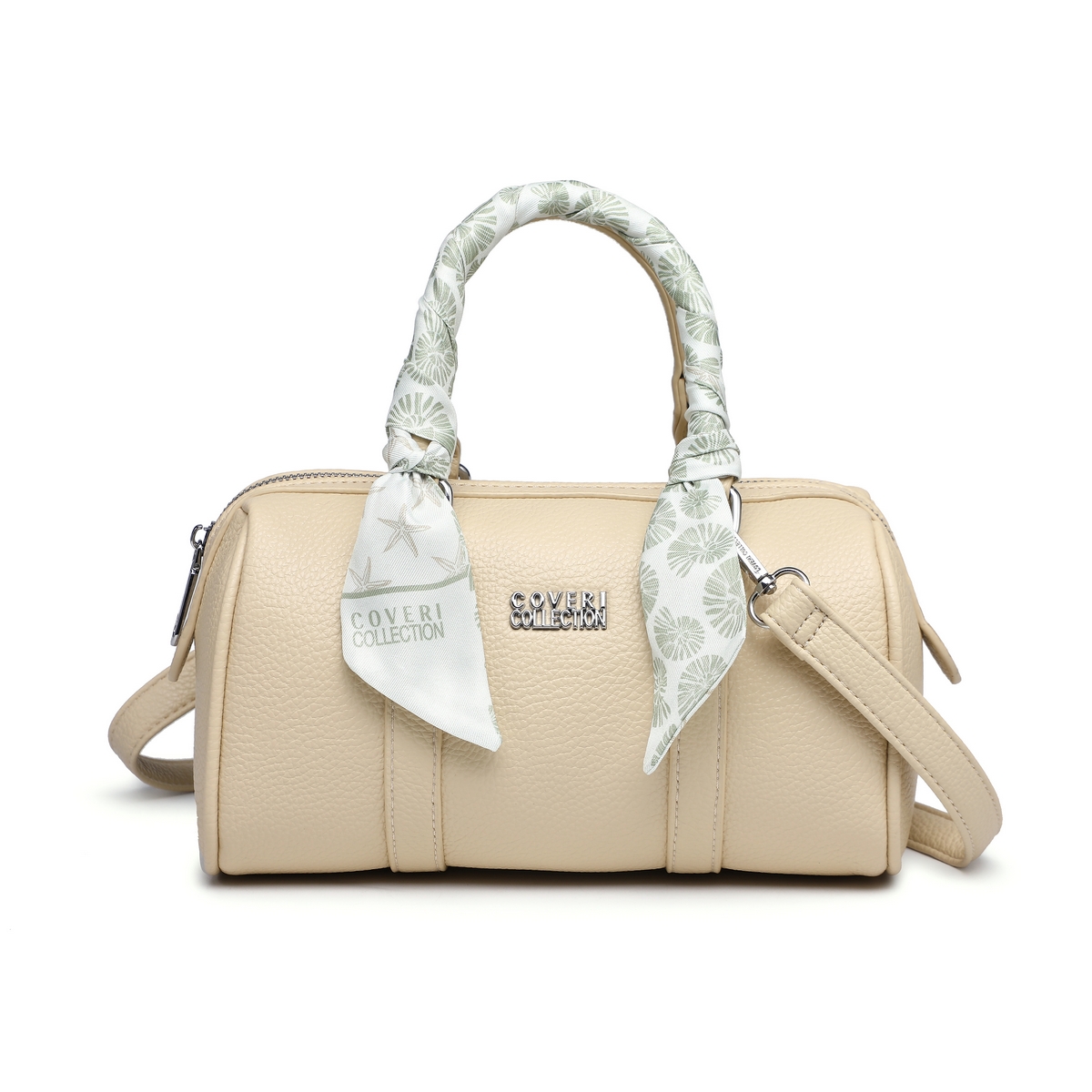 Γυναικεία Τσάντα Δερματίνη Coveri χεριόυ βαρελάκι με διακοσμητικό μαντήλι λουλούδια .Διαστάσεις: Πλάτος 24εκ. × Ύψος 14εκ. × Πάτος 10 εκ.