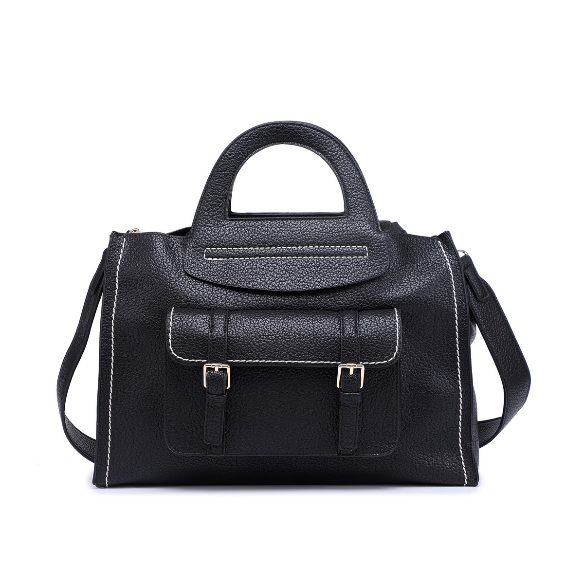 Τσάντα Δερματίνη χειρός με δυο οβάλ σχήματος χέρια και μπροστινό τσεπάκι με λεπτομέρειες άσπρες ραφές. Διαθέτει ιμάντα που αυξομειώνεται για χιαστί. Διάσταση: Πλάτος 38 Χ 26 Ύψος Χ 12 Πάτος