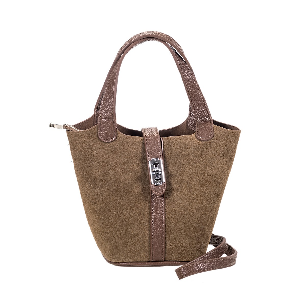 Γυναικεία τσάντα μικρή με σουέτ και δερμάτινο κουβαδάκι και μεταλλικό ασημένιο κούμπωμα