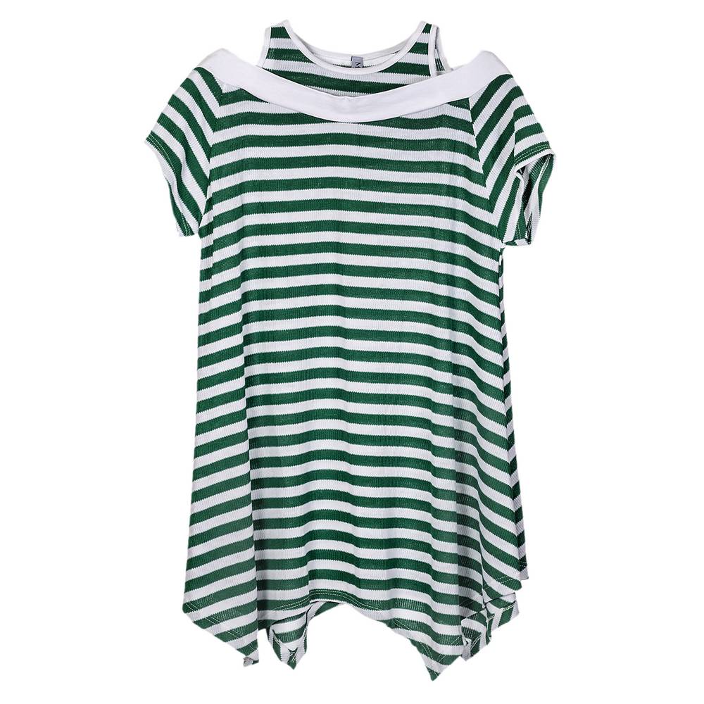 Μπλούζα βισκώζ κοντομάνικη ριγέ ασύμμετρη στο πλάι με ενσωματωμένο ραντάκι. Σύνθεση: 95% Βισκώζ/5% Ελαστίνη