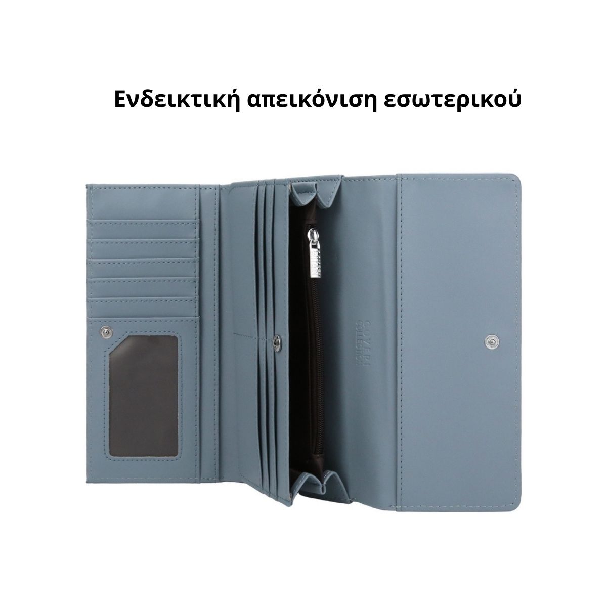 Πορτοφόλι γυναικείο Coveri μεγάλο μέγεθος δερματίνη με καπάκι . Διαθέτει εσωτερικά πολλές θήκες για κάρτες, ταυτότητα , χαρτονομίσματα και για κέρματα. Διάσταση: Πλάτος 19 Χ Ύψος 10