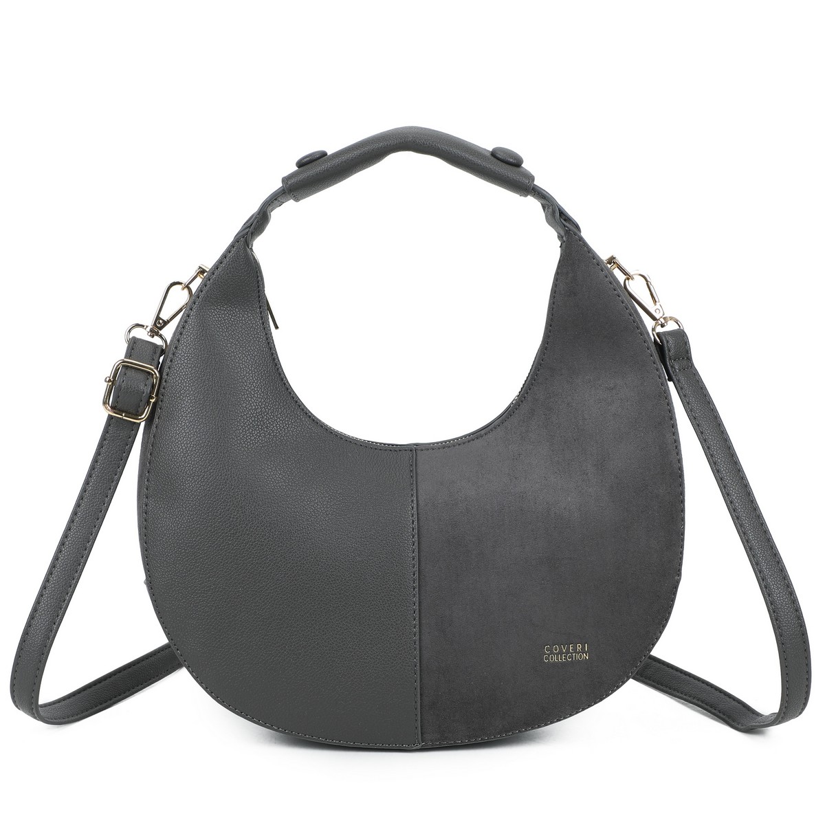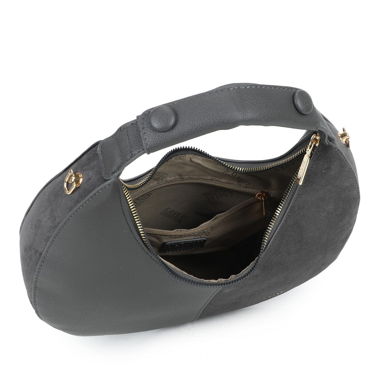 Γυναικεία τσάντα Coveri τύπου “half moon” . Διπλή υφή suede και δερματίνης, ιδανική για ώμου ή χιαστί. Διαθέτει εσωτερικές θήκες και αποσπώμενο ρυθμιζόμενο λουρί. Διαστάσεις: Πλάτος 30 × Ύψος 29 × Πάτος 7 εκ.