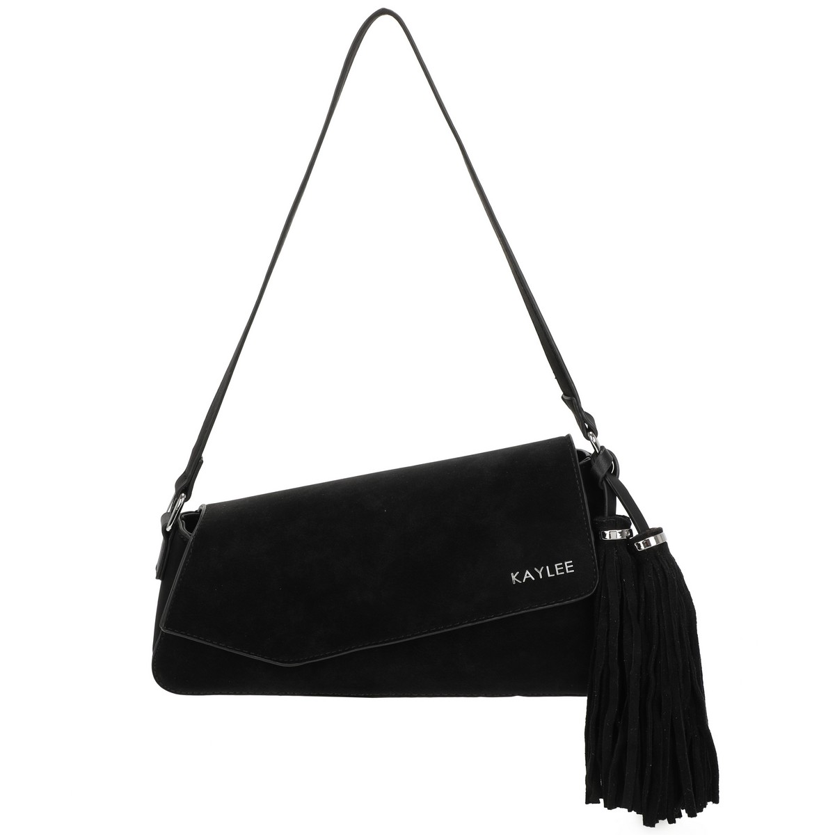 Γυναικεία Τσάντα Kaylee σουέτ τύπου ώμου και χιαστί με καπάκι και διακοσμητικό κρόσσι. Διαθέτει εσωτερική επένδυση με φερμουάρ και βοηθητικές τσέπες.Με ρυθμιζόμενο λουρί. Διαστάσεις: Πλάτος 27 × Ύψος 14 × Πάτος 7 εκ.