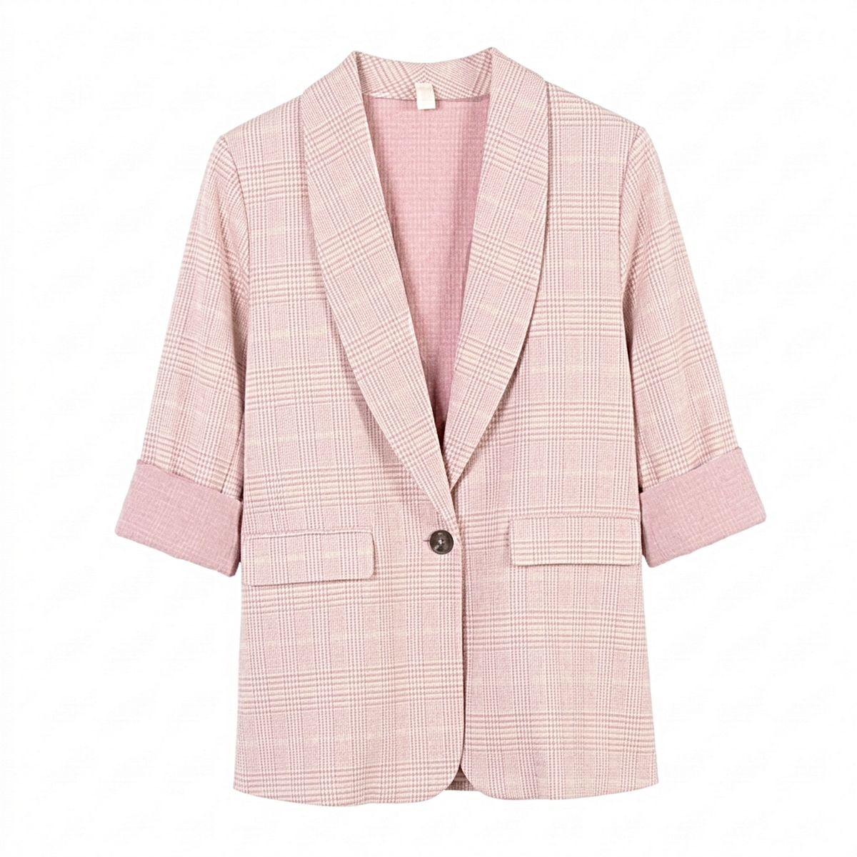 Γυναικείο Σακάκι τύπου καρώ με 1 κουμπί και 2 εξωτερικές ψευτότσεπες . Σύνθεση : 62% Πολυεστέρας / 35% Νάιλον / 3% Ελαστίνη