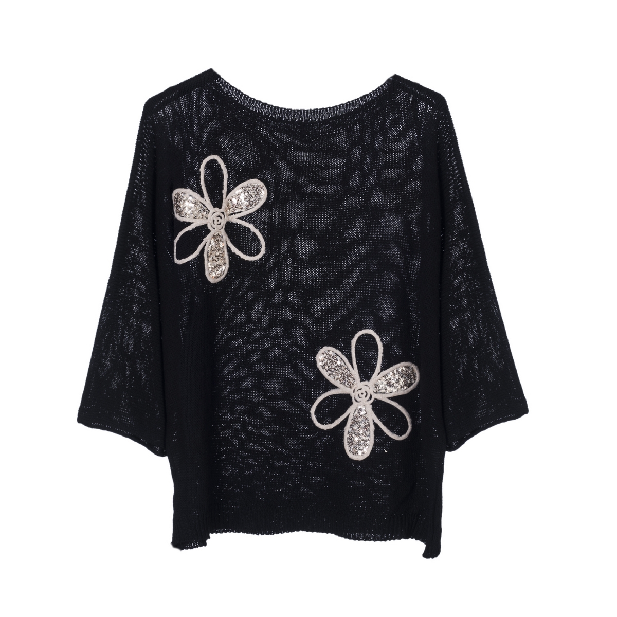 Γυναικεία μπλούζα πλεκτή τρουακάρ με δύο λουλούδια και πούλιες . Σύνθεση : 50% Βαμβάκι / 50% Ακρυλικό