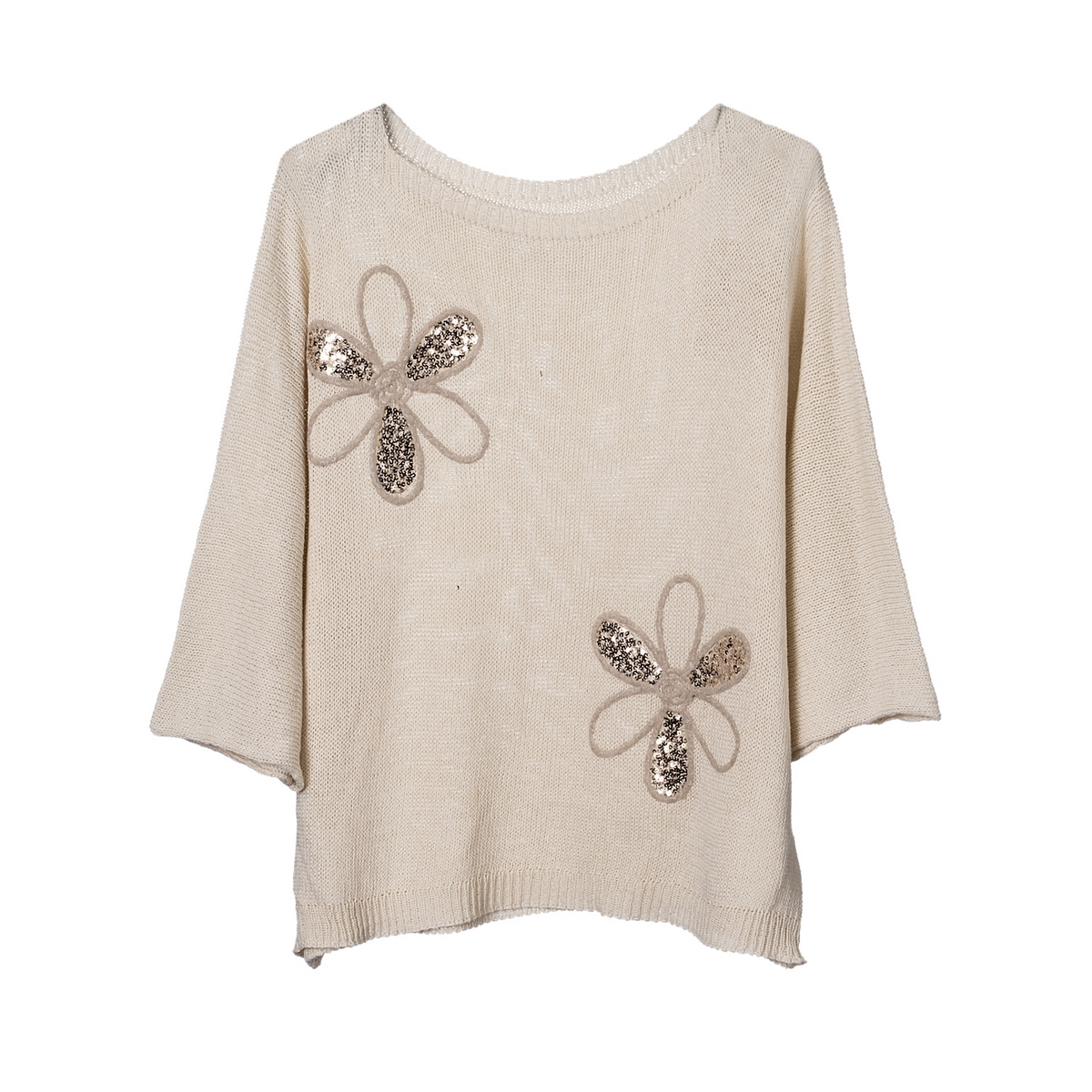 Γυναικεία μπλούζα πλεκτή τρουακάρ με δύο λουλούδια και πούλιες . Σύνθεση : 50% Βαμβάκι / 50% Ακρυλικό