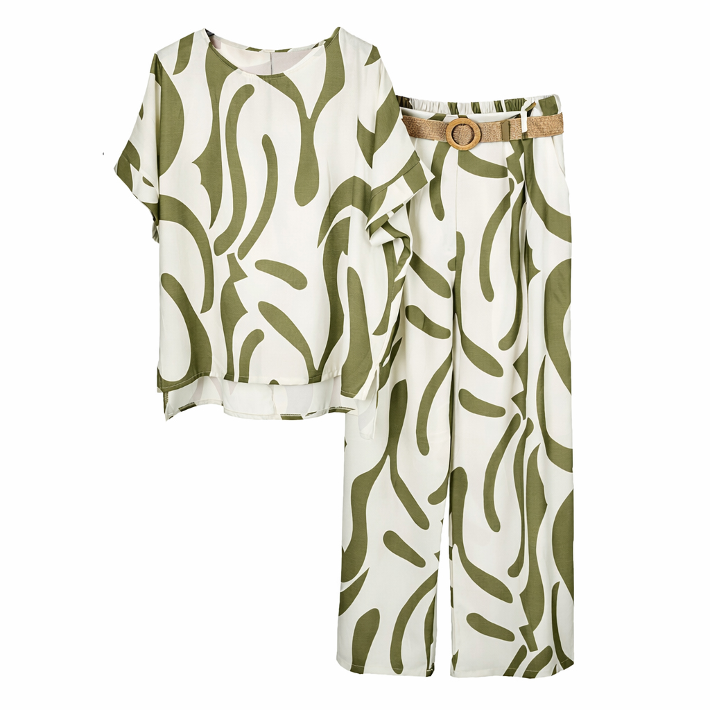 Γυναικείο σετ παντελόνι-μπλούζα εμπριμέ με ψάθινη ζώνη στο παντελόνι . Σύνθεση : 30% Βισκώζ / 70% Πολυεστέρας