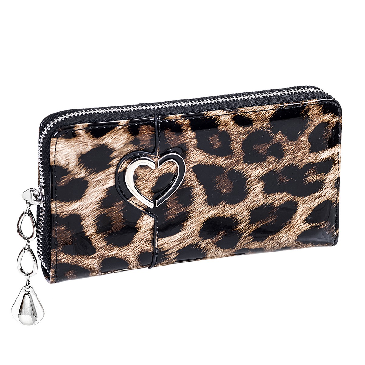 Πορτοφόλι γυναικείο μεγάλο λεοπάρ λουστρίνι με μεταλλική καρδιά . Διάσταση: Πλάτος 19 Χ Ύψος 10